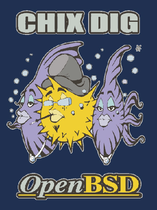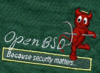 "OpenBSD 3.8" on a brown shirt.