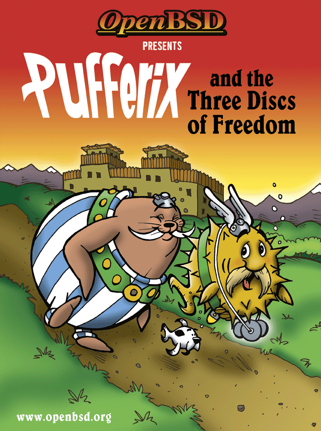 The back features a Frazetta-style painting by Ty Semaka for the "Puffy the Barbarian" theme of the OpenBSD 3.3 release. The front contains a modified quote from the Conan the Barbarian movies.