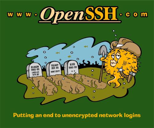 Nice dark green T-shirt — back has the blowfish SSHeriff burying the old insecure protocols, and the front has 'SSH — Don't tell anyone it's free!' This T-shirt is made out of a dark green material. If you don't know what this T-shirt is about, check out the OpenSSH web page.